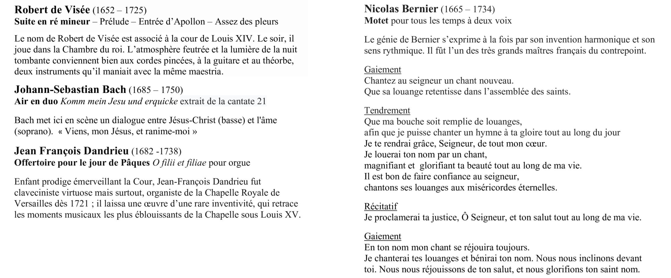 6 AVRIL 2026 – SPLENDEURS BAROQUES POUR LE TEMPS DE PÂQUES Concert donné au temple Saint-Eloi de Rouen le 6 avril 2026 INTERPRÈTES Sandrine Décure soprano Sylvain Baudry baryton Sabine Duguay violoncelle baroque Vincent Bénard clavecin et orgue Alexander Bach théorbe PROGRAMME